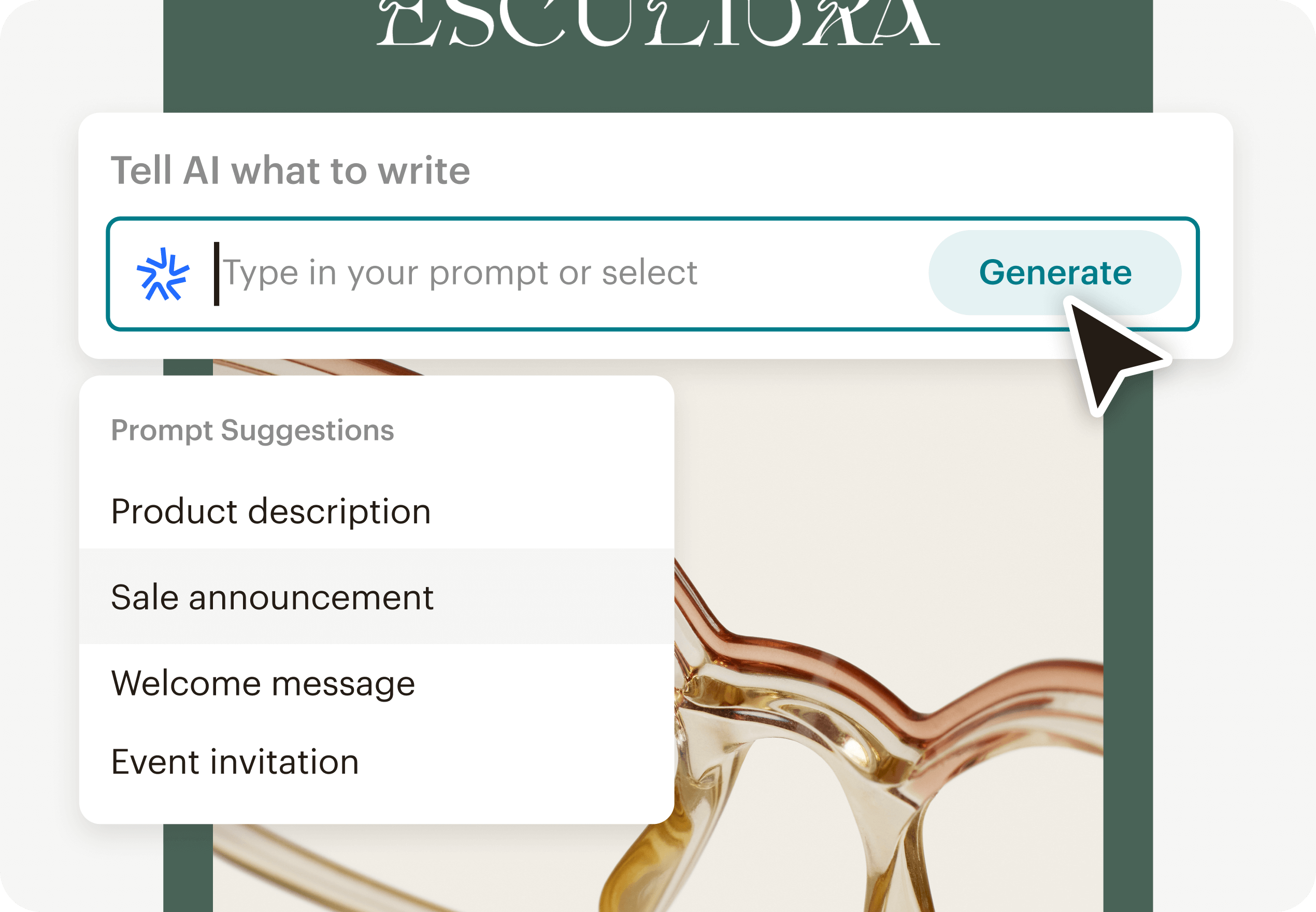 Image of an abstract view of an email interface, where the headline is being actively edited using Mailchimp's generative AI builder feature. The AI suggests creative and engaging headlines and also offers prompt suggestions such as a sales announcement.
